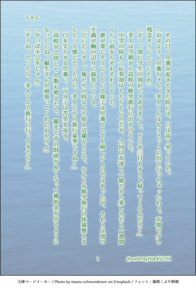 xw0z9qHtk452354☆quiet followDONEテーマ:【海風】【鬼の居ぬ間の洗濯】(+2h)CP:なし登場人物:尽義、百々子、伊吹、金崎、薪田、鞍馬、幸人SSのネタバレと捏造ありちょっと触れた尽義の修学旅行話は、以前のワンライ(雪見障子と充電器の回)で書いたものです#あやかい真剣60分一本勝負(11/11) show all(+10 images) Tap to full screen (size:630x928).Repost is prohibited Let's send reactions! freqpopularsnackothersPayment processing Replies from the creator Follow creator you care about!☆quiet follow xw0z9qHtk452354DONEテーマ:【ルート】【羊】(+1h)CP:なし 登場人物:幸人、茶太郎、夜胡、いばら、尽義、百々子(、名前のみ登場のオリキャラ)大いに願望入ってます文系数学(Ⅱ・B)までの記憶を掘り返し、色々確認しつつ書きましたがなにか違っていたらすみません私の時と現在の学習年は変わってる可能性あるので、あの島ではこうということにしておいてください#あやかい真剣60分一本勝負(8/8) 8 xw0z9qHtk452354DONEテーマ:【秋刀魚】【労働】CP:なし登場人物:尽義、幸人、真人、春秋、朱、百々子、ハツ幼少期メインに、現在軸も少し#あやかい真剣60分一本勝負(6/6) 6 xw0z9qHtk452354DONEテーマ:【骨】【「理屈はいいから」】(+1.5h)CP:なし登場人物:幸人、茶太郎、夜胡、いばら、尽義、百々子ちょこちょこ捏造要素あります#あやかい真剣60分一本勝負(8/8) 8 xw0z9qHtk452354DONEテーマ:【祭り】【スタンプ】CP:なし登場人物:幸人、尽義、百々子高1の夏祭り成績に関しては完全な妄想ウェブオンリー展示作品「夢からまことが出るならば」(支部にアップ済)とリンクしていますが、これのみでも読めます#あやかい真剣60分一本勝負(8/8) 8 xw0z9qHtk452354DONEテーマ:【ぎゅっ】【澪標】(+1h)CP:なし登場人物:幸人、茶太郎、夜胡、いばら、尽義、百々子、オリキャラ古典教師幸人高1の夏※ぎゅっは幸人→尽義ですが、この時点では兄弟・師弟としての感情想定オリキャラいます参考にしたのは田辺聖子先生の「新源氏物語」(新潮文庫)の澪標と蛍の部分です。#あやかい真剣60分一本勝負(9/9) 9 xw0z9qHtk452354DONEテーマ:【ローストビーフ丼】【鎖】(+1h)CP:なし登場人物:朱、薪田、鬼無里島に帰って一年ほどの朱の誕生日SS6、7のネタバレあり伊吹の意図やこの時期のことなど、かなり捏造しています#あやかい真剣60分一本勝負(8/8) 8 related works xw0z9qHtk452354DONEテーマ:【冬の花火】【メガネ】(+1h)CP:なし登場人物:尽義、稲生、百々子噴火から一年くらい経った頃の話実際の法律や制度を調べたわけではないので、おかしい所がありましたらご容赦を勝手な捏造設定もあります#あやかい真剣60分一本勝負 (6/6) 6 xw0z9qHtk452354DONEテーマ:【XYZ】【指輪】(+1.5h)CP:幸尽(成立済)登場人物:幸人、尽義、茶太郎、夜胡、いばら、薪田、伊吹幸人20歳↑の未来時空春と朱は和解しています#あやかい真剣60分一本勝負(9/9) 9 xw0z9qHtk452354DONEテーマ:【海風】【鬼の居ぬ間の洗濯】(+2h)CP:なし登場人物:尽義、百々子、伊吹、金崎、薪田、鞍馬、幸人SSのネタバレと捏造ありちょっと触れた尽義の修学旅行話は、以前のワンライ(雪見障子と充電器の回)で書いたものです#あやかい真剣60分一本勝負(11/11) 11 xw0z9qHtk452354DONEテーマ:【ルート】【羊】(+1h)CP:なし 登場人物:幸人、茶太郎、夜胡、いばら、尽義、百々子(、名前のみ登場のオリキャラ)大いに願望入ってます文系数学(Ⅱ・B)までの記憶を掘り返し、色々確認しつつ書きましたがなにか違っていたらすみません私の時と現在の学習年は変わってる可能性あるので、あの島ではこうということにしておいてください#あやかい真剣60分一本勝負(8/8) 8 xw0z9qHtk452354DONEテーマ:【結界】【らくがき】CP:なし登場人物:尽義、百々子、オリキャラ尽義がまだ小学生だった、噴火翌年の春の話※オリキャラがいます!何時間かかったか分からない(ワンライとは……)#あやかい真剣60分一本勝負 (9/9) 9 xw0z9qHtk452354DONEテーマ:【カラオケ】【禁】(+1h)CP:なし登場人物:幸人、尽義、伊吹、鞍馬人によってキャラ崩壊と感じる箇所があるかもしれません曲はお好きなもので想像していただければ#あやかい真剣60分一本勝負(10/10) 10 xw0z9qHtk452354DONEテーマ:【狐火】【初音】(+1.5h)CP:なし登場人物:幸人、茶太郎、夜胡、いばら、尽義、百々子高2の冬のお話#あやかい真剣60分一本勝負(9/9) 9 xw0z9qHtk452354DONEテーマ:【秋刀魚】【労働】CP:なし登場人物:尽義、幸人、真人、春秋、朱、百々子、ハツ幼少期メインに、現在軸も少し#あやかい真剣60分一本勝負(6/6) 6 xw0z9qHtk452354DONEテーマ:【嫉妬】【アルカンシエル】(+1h)CP:朱春・幸尽前提、春と幸のCPっぽい発言(左右はお好きな方で)があります登場人物:幸人、尽義、春秋、朱、稲生朱春/幸尽前提の未来設定(作中でいちゃついてないが付き合っている)なのに春と幸がレストランで……という話#あやかい真剣60分一本勝負(7/7) 7 recommended works Natalia OTSDONE(前文见主页) 5876 FlowerdumplingliDOODLE加油博兹雅人民厚乳你✊ 2 みっぽんずDOODLEビタミンカラーな沼たち 3 hzzzzzyiiiDONE10月27日 COMIC CITY SPARK 19にて無料配布していた🔞沢深です!ハロウィ