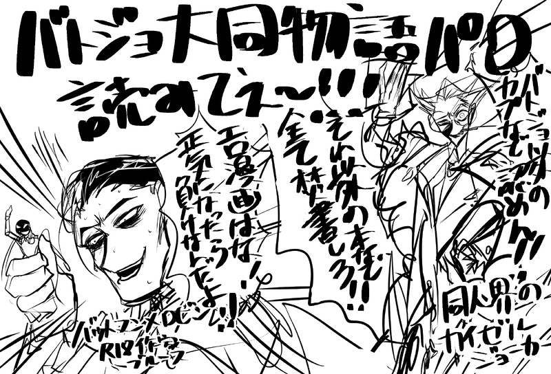 中 村☆quiet followDOODLE昼は社長、夜はバットマンxロビンのショタエロ同人作家の2つの顔を持つブルースウェイン(イベントはバットマンコスで参加)主に夏と冬にゴッサムで3日間かけて行われるゴッサム最大の大規模同人誌即売会『ゴッサムコミケット』に参加する為、今年も新刊を作成していた。しかし、ゴッサムコミケット内で自分の推しカプ以外を焚書し、バトジョ強火過激派(逆カプ不可)の本を書く事を強制する皇帝ジョーカーが現れる奴~!!! ##BATJOKES Tap to full screen (size:2500x1700).Repost is prohibited Let's send reactions! freqpopularsnackothersPayment processing Replies from the creator Follow creator you care about!☆quiet follow 中 村DOODLE描く度に顔変わるし、オールバックのベタって丁寧にやらないと汚くなるのもキツい 中 村DOODLEやっぱりゴッサムビックサイトで行われる、夏のゴッサムコミケットのブルースウェイン産業の企業ブースではバット抱き枕(リバーシブル仕様で裏がえっちなアレ)が販売されたてるのかな・・・欲しい・・・多分高級シルク使用で同人抱き枕にしては安っぽくない作りで値段がお高そう(確信) 中 村DOODLE昼は社長、夜はバットマンxロビンのショタエロ同人作家の2つの顔を持つブルースウェイン(イベントはバットマンコスで参加)主に夏と冬にゴッサムで3日間かけて行われるゴッサム最大の大規模同人誌即売会『ゴッサムコミケット』に参加する為、今年も新刊を作成していた。しかし、ゴッサムコミケット内で自分の推しカプ以外を焚書し、バトジョ強火過激派(逆カプ不可)の本を書く事を強制する皇帝ジョーカーが現れる奴~!!! 中 村DONE2023年のバトジョの日の為の漫画です。車は描きたくない!でもバトジョにチキンレースして欲しい!!!!!と言う苦肉の策でこうなりまんた。今回のテーマはボーボボリスペクトです。それはそうと、ビースト覚醒のPVの司令官の変形めちゃくちゃカッコよくて“アガ”りました。 2 中 村DOODLEアメリカで1番有名な🐰バッグスバニーなジョーカーさんです 中 村DONEメリクリバトジョ〜!!!! (しかし片思いハート)