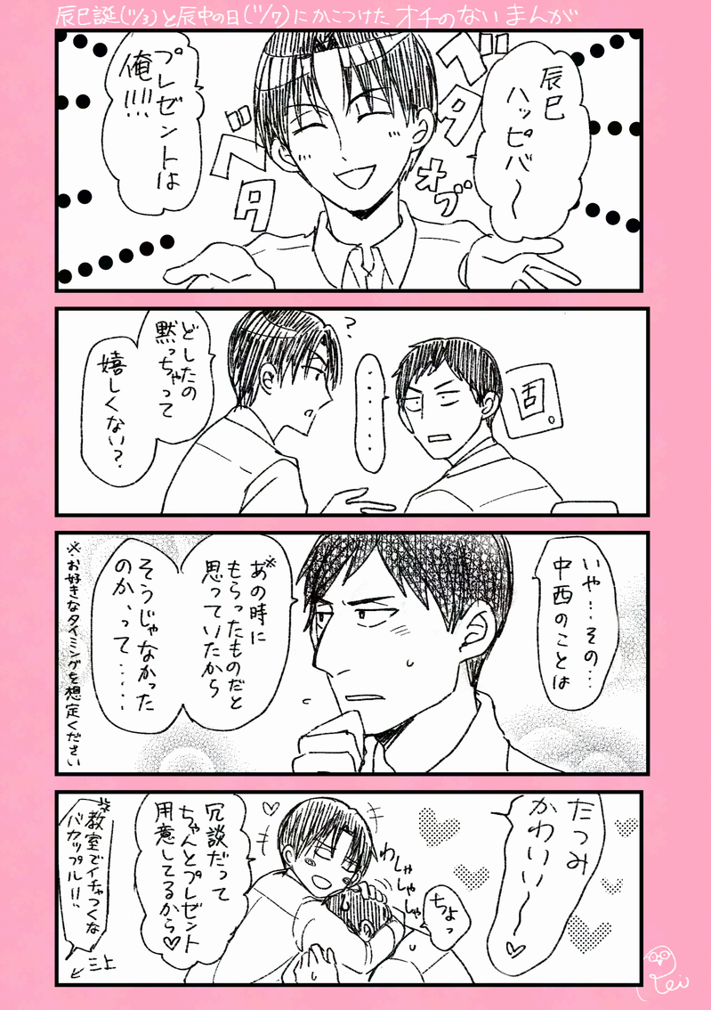 🦉の絵置き場(仮)☆quiet followDOODLE辰巳誕と辰中の日のまんが オチが一切ない Tap to full screen (size:1410x2000).Repost is prohibited Let's send reactions! freqpopularsnackothersPayment processing Replies from the creator Follow creator you care about!☆quiet follow 🦉の絵置き場(仮)DONE【トシキュウ】フォロワーさんの小説を読んで勢いで描いた いちゃついてます 🦉の絵置き場(仮)DOODLE※バト笛武蔵森いつも以上に走り書きの落書き。当時のノリを知ってる人向け 1カットだけ渋三っぽい 4 🦉の絵置き場(仮)DONE2025年1月26日 bttf11で配布していた、武蔵森本準備号です。5月にちゃんと本にしたい。 8 🦉の絵置き場(仮)PAST中西誕間に合わなさそうなので、夏に出した辰中本の誕生日ネタ部分をWEB再録しときます。在庫あるので1/26のbttf11にも持っていきます〜。同級生時空で付き合ってる辰中。 4 🦉の絵置き場(仮)DOODLE辰巳誕と辰中の日のまんが オチが一切ない 🦉の絵置き場(仮)SPOILER馬と猿が会話してるだけ(ネタバレ注意)逆検2を最後までクリアしていますか?(yes/no)