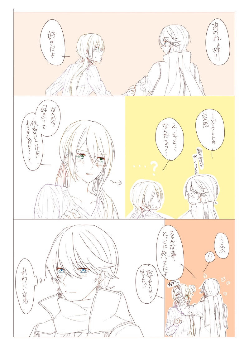 柚李本丸の刀さには乙女ゲー方式でルート分岐しているイメージ。堀さにの柚李は修行前の堀川にもらったリボンと、揃いのピアスをつけている。