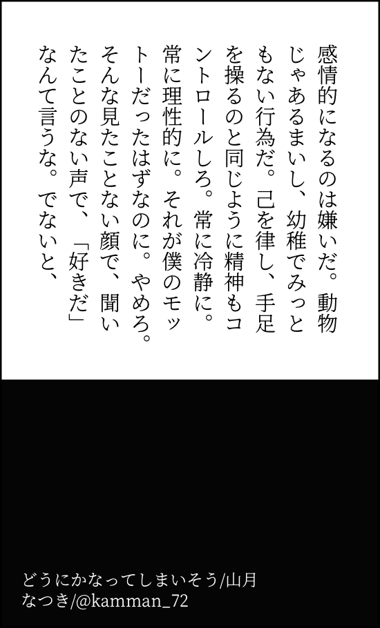 なつき☆quiet followMOURNING改めて見るとツッキー山口のこと大好きじゃんね…? #山月 moonOverAMountain show all(+7 images) Tap to full screen (size:550x910).Repost is prohibited Let's send reactions! freqpopularsnackothersPayment processing Replies from the creator Follow creator you care about!☆quiet follow なつきMOURNING140字(桐ゴロ、斎沖含) 17 なつきMOURNING140字のあれこれ(見参維新含 13 なつきMOURNING体の関係から始まる桐真 4 なつきMOURNING春日誕(オールキャラ) 4 なつきMOURNINGキャンプ飯とサームラ誕 12 なつきMOURNING7後の桐←真 4 related works なつきMOURNING改めて見るとツッキー山口のこと大好きじゃんね…? 8 ikuko48925338TRAINING『月山か山月かわからないぬるいエロ』※アートだからR18ではない←言い張る。 10 まるですDONE高校生🌙が大人⛰️にキュンキュンする話です。ナニしてる🌙が読みたかったんです…… 636 まるですDONE2024,12,20〜22ネコとカラスの休戦日webオンリーイベントにて展示させて頂いたものになります!高校生山月と謳ってはおりますが...!よろしくお願いいたします! 5 キミタおじさんのなにか👨🍼MENU2/12 RTS!!38に参加します~☺️【東5 ヌ41b】【梅里】【山月】【小説作品】山口×月島新刊ないよ!!既刊だよ!!無配あるよ!!R18だよ!!年確あるよ!!ごめんね!!ワートリ腐向けの辻犬も2冊くらいあるんで持っていきま~す🤗よろしくお願いし、ます! tikutaku_katiDONEpixivに上げたやつです。ハ.イキ.ューで山月になります。烏野の皆んなに背中を押されて告白する山口くんです。感想とか貰えると嬉しいです💕 5166 sakuramoti_0928SPOILERハイキュー漫画あり。Twitterに上げたものです。 4 ikuko48925338TRAINING受けてるかんじの月島【山口が地雷の人見ちゃダメ笑】 4 yyyu_sukeeeDONE山月、交渉 2