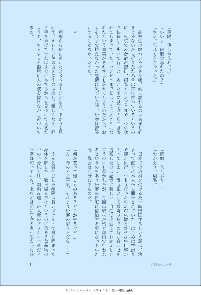 Maki_1441☆quiet followDONE研日ワンライ『相合傘』『濡れる』原作終了数年後のイメージサブタイトルは10年越しの答え合わせ show all(+4 images) Tap to full screen (size:888x1300).Repost is prohibited Let's send reactions! freqpopularsnackothersPayment processing Replies from the creator Follow creator you care about!☆quiet follow Maki_1441DONE勝手に侑日インタビュー⑫┊ 侑→日の番この頃のふたりはきっとぽんぽんテンポ良い会話してるんだろうなそしてうちのは相変わらずmyで変換 Maki_1441DONE勝手に侑日インタビュー⑪最初は話の内容を出すのに乗り気じゃないツム、半々のラインは譲れない Maki_1441DONE影日ワンライ『生クリーム』日向お誕生日ネタです。お付き合い前の影日想定。もう暫くは恋の自覚が無さそうな。マリーゴールドの花言葉、色や種類で様々ありますが花が咲き誇った時二人はどうなっているのか。「予言」、特にお気に入りです。 8 Maki_1441DONE佐久日ワードパレット18レモングラス『代わり』『スパイス』『あなたじゃない』初書きの佐久日レモングラスって虫除け効果もあるんだなーって知ったので。決して油断してたわけじゃない臣さんと彼の1番が自分だって疑ってない翔陽さんの短い話 Maki_1441DONE侑日ワードパレット22『震える唇』『待って』『不器用』同棲侑日。いってらっしゃいのちゅーの話。 2 Maki_1441DONE侑日ワードパレット14やみつき 『おねだり』『しみる』『もっとほしい』たまには砂糖を煮つめたような甘ったるい侑日でも recommended works ポイピクミッシェルさんDONE月イチ企画の第七弾です。サイチくんが一人で🚬吸ってるだけのお話です🤭 2986 ErgoGidaDONEHer beloved Eleventh was misbehaving Some punishment is overdue 🫢for the TransMasc Tartaglia Zine! Are you 18+? y/n 橙熟森林🍊DOODLE花园if… わたあめDOODLE土井半助、失踪。 jmilytm95DOODLE治侑 2 gaohiruDOODLECoC『ヴェルネの天使は死を歌う』2024年12月21日~開幕 sachiDONEアルアニアドベントカレンダー企画の参加作品です/ゲキタク聖夜衣装のアルアニ❄️ 2 こと鍋DOODLEPC久次米まりあ 4 ノヴだのノッヴだのヴォムだのDONE前編投稿しました、よろしくどうぞ~🌕✨https://www.pixiv.net/artworks/125381305どっかのシーン描きなおすとかは特にしてないですが、ネームからテキストの表現をほぼ全部大幅に見直してるので、読みやすくなってるといいなあ…