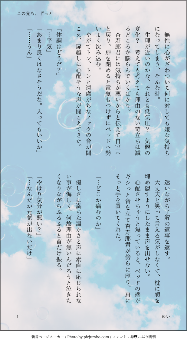 めいの小話☆quiet followDONE🔥🌸夢。調子が悪くてどうしても気分が辛い時に彼が傍にいてくれたなら、を夢見てみました。 show all(+5 images) Tap to full screen (size:618x1132).Repost is prohibited Let's send reactions! freqpopularsnackothersPayment processing Replies from the creator Follow creator you care about!☆quiet follow めいの小話DONE🔥🌸夢。「三度目の正直でなくても」また祝えた幸せをこめて、ありがとうとお誕生日おめでとうー!!モーメントが追加できないようなのでこちらに。 10 めいの小話DONE🔥🌸夢。調子が悪くてどうしても気分が辛い時に彼が傍にいてくれたなら、を夢見てみました。 6 めいの小話TRAINING🔥🌸夢。行き過ぎた行為をしてしまって…のすれ違いを呟いていたら一部でも書きたくなって。大人向けですのでご注意下さい。 5 めいの小話MOURNING🔥🌸夢、🔥視点。好きな表現でのちょっぴり一場面。直接表現はありませんが大人向けです。 2 めいの小話TRAINING🔥🌸夢。大人向け描写ありの朝の一時です。 4 めいの小話TRAINING🔥🌸夢。大人向けの短いものです。純情とはかけ離れたものなのでご注意下さい。 2 recommended works ɴᴇɴᴇDONE今なら厚塗りができるかもしれない…!となってやたら時間かけて描いたやつ。この絵のためにバーキンでワッパーセット買ってきた思い出。たんとお食べ ユウナMOURNING挫折した描き初めあけおめ絵です蛇と言ったら八雲でしょうが…ッ!!!!!!(※八雲右勢だ!逃げろッッッッ!!!!!!) cokoTRAINING今年もよろしくお願いします! b_osm1231MEMO暇つぶし。ワンクッション入れたい内容なので、こちらで 1424 まりねDOODLE250103 新しいシャープペンシルを買ったので試し書きがてら。少しポーズがあざとかったかもしれない🐏🐑 tomokoTRAINING2023年12月10日 お題で書こう30日間特訓 20日目『続 カホゴコバナレオヤバナレ』〔書き出し〕 恐らくそれは、“ハズレ”だったのだろう。〔文末〕それでもまだ、理解されたいような気がしていた。 6 j_c_crewDONEトライバルもどき 巳 2025 Ver. のん🐰DONE2025年謹賀新年🦊 たかせDONEKuniShiba ChristmasEnglish translation by Hella(@KaguraShiba)Thank you! 3