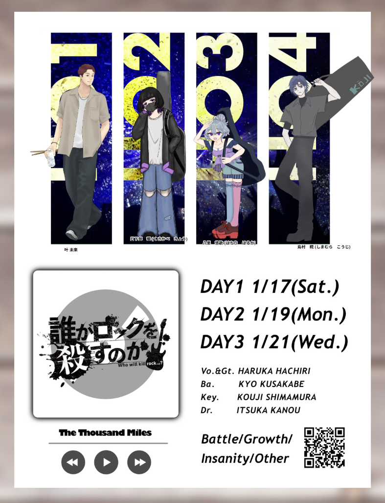kinon_trpg☆こそフォロお知らせ2026.1.20CoC 6th シナリオ『誰がロックを殺すのか』KP:しゃちくさんHO1 Dr:叶 未来(キノ)HO2 Ba:日下部 響 (明太子さん)HO3 Vo&Gt:八里 悠歌(由樹さん)HO4 Key.:島村 糀(ういさん)全生還にてシナリオ閉幕!皆と音楽ができてまじで嬉しかったです。ありがとう。 タップで全画面(原寸:787x1027)無断転載禁止 リアクションをたくさん送って応援しよう! よく使う人気おやつその他支払処理中 作者からのリプライ 気になる人をどんどんフォローしよう!☆こそフォロ kinon_trpgお知らせ2026.1.20CoC 6th シナリオ『誰がロックを殺すのか』KP:しゃちくさんHO1 Dr:叶 未来(キノ)HO2 Ba:日下部 響 (明太子さん)HO3 Vo&Gt:八里 悠歌(由樹さん)HO4 Key.:島村 糀(ういさん)全生還にてシナリオ閉幕!皆と音楽ができてまじで嬉しかったです。ありがとう。 kinon_trpgお知らせ2026.1.11CoC 6th シナリオ『やわらかな希求』KPC/KP:泉 英(キノ)PC/PL:泉 京夜(あずみさん)シナリオ閉幕!お前らはまじで平和でいろ! kinon_trpgお知らせ2025.12.19CoC 6th シナリオ『夜半の嵐』KPC/KP:南雲 桜火(キノ)PC/PL:鶴岡 千羽(しゃちくさん)END Aにてシナリオ閉幕!めっちゃ楽しかったぜ!ちーちゃん、手握っててな。 2 kinon_trpgお知らせ2025.11.23CoC 6th シナリオ『君を土に埋める日』KP:わんわんおさんPC/PL:山荷 葉介(キノ)シナリオ閉幕~!!!!!あはははは!!!!これやばいわ!えっぐいえぐい! kinon_trpgお知らせ2025.11.21CoC 6th シナリオ『ポメポメパニック』KPC/KP:石鷲見 カフカ(キノ)PC/PL:灰葉 燈香(もりさん)かふとも継続!ポメになってきたぜ!腹くくるぜwwwwww kinon_trpgらくがき おすすめ作品 lxwmiruらくがきうおおおおおおお自給自足漫画がなかなかうまくすすまないしへんならくがきばっかしちゃうからランクマ行ってくるビング俺!すべて幻覚だからまともなツッコミはしないでくれ ナエティマスらくがきギラす Octocomics-BLらくがき tokimemomoeri作業進捗新刊表紙できた!タイトルはちょっとまだアレですが風本七マリのわちゃわちゃです。たぶんポッピーな雰囲気になったと思う。あとは中身頑張るぞ💪 butsuri_sm過去のを晒すディさんにに💋付けられてるイです。 odamatsunosukeできた ゆるめの箱らくがき絵柄変えあそび📖🍬 Ichisakiosusi9らくがき神崎慧靂…のことをまだフワッとしか知らない人が描いたらくがきなので解釈違いとかあればすみません。フリフリ衣装描きやすくていいね! kedamataku_05お知らせCoC 「エンジェル・デビル・インプロパー」KP/たま也PC/PLHO1 月島 満/UyaさんHO2 四十住 紅亜/さくらさん《探索者両生還》