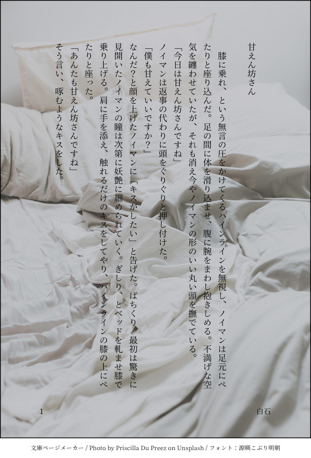shira_an_ishi☆quiet followDONE画像1枚で完結するお話を書きたくて。 Tap to full screen (size:630x928).Repost is prohibited Let's send reactions! freqpopularsnackothersPayment processing Replies from the creator Follow creator you care about!☆quiet follow shira_an_ishiINFO7月13日 星に願いを ノイマン受けオンリー"日誌を伏せた操舵手"で発行のハイノイ短編集「今日はなんの日?まとめ。」のサンプルです。「今日はなんの日?」と「今日はなんの日?そのに。」を再録したものとなります。10月27日の無配・ハロウィンのお話、冬至のお話、Xで投稿済み7個の再録と、書き下ろし6個を収録予定です。サンプルとして書き下ろしの一つ、5月4日みどりの日のお話を掲載します。 933 shira_an_ishiPROGRESS表紙(仮)と目次(仮)こんな感じですよ、ってことでチラ見せです。あとちょっと書けば原稿終わる。頑張ろう。 2 shira_an_ishiDONE恵方巻きネタ。下ネタです。全然エロくない。一応🗝ノイ誕。 shira_an_ishiDONE12月11日『陰茎』タイトルがあからさまだし、ぬるいけどR-18なのでポイッと。🗝ノイ誕生日 4 shira_an_ishiPASTタグで出したやっぱりやーめた、のやつです。9月頃に書いた気がします。世に出すつもりはなかったのですが、ちょっとエロいの出してみたかったので…。全部ではないです。途中まで!そんなにエロくないです。ノイの同意無し。ごーかんです。🗝ノイ誕生日 2 shira_an_ishiREHABILIなんか小説書けなくなってきたのでリハビリ。大遅刻の「いい兄さんの日」です。3月か7月の新刊予定『今日はなんの日?そのに』にいれる1つとして、肉付けしてから収録しようかなと思ってます。たぶん。 recommended works peachnpuccaREHABILI铁瘫 惯用伎俩 yuna_bDONE【腐】ハロウィンにかこつけていちゃいちゃする💙🦅何も考えず勢いだけで読むこと。「随分可愛らしいイタズラだなァ?No.2」「るっせ!」 tiyozukiDONEというわけで主破留の誕生日なので描きましたあああああ うめつなDOODLE2024年分の過去絵 58 ダンブルドアDONE1年まとめ(版権)⚠東方以外もちょびっと入ってる 68 iaiaqhDONEC105お疲れさまでした!来てくださった方々ありがとうございます!今回も和洋折衷コーデで参加させていただいたのでうちの子に着せてみました。髪の毛の色違いすぎて誰やねん状態ですがきっとおめでとさんした後。全身コミケ後遺症(筋肉痛)がすごくてまだ動けません。来年一発目0時からアニバン楽しみだぜー。 screamwandererPROGRESS 鈴春゜DOODLE さくらこDOODLE律霊。おしがま、そしてもらす……ハアハア18↑? 4