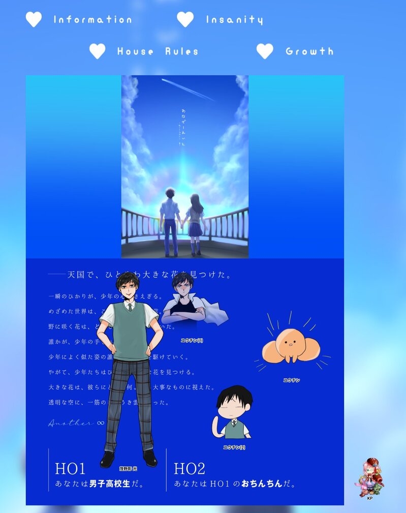 tan2002shun☆こそフォロ供養CoC「あなざーえいと ~another ∞~」鈴木翔平様作KP:エリをットPL(PC)HO1 春休(茂野影 光)HO2 うつわ(ユウチン)2026/01/03シナリオクリア✨年明けにめちゃくちゃにツッコミ入れました面白過ぎてずっと笑ってましたwwwありがとうございました。 タップで全画面(原寸:1102x1391)無断転載禁止 リアクションをたくさん送って応援しよう! よく使う人気おやつその他支払処理中 作者からのリプライ 気になる人をどんどんフォローしよう!☆こそフォロ tan2002shun供養CoC「ファーストキスは君以外」KPC(KP):尊巳押汰(春休)PC(PL):独鈷羅翔(ドク)2026/01/15.16シナリオクリア独鈷の勢いって健康になるんですよね尊巳は見てて楽しいなってなってました。やんちゃな独鈷かわいいなぁ^^ tan2002shun供養CoC「あなざーえいと ~another ∞~」鈴木翔平様作KP:エリをットPL(PC)HO1 春休(茂野影 光)HO2 うつわ(ユウチン)2026/01/03シナリオクリア✨年明けにめちゃくちゃにツッコミ入れました面白過ぎてずっと笑ってましたwwwありがとうございました。 tan2002shunネタバレCoC 「庭師は何を口遊む」HO3ネタバレ絵※シナリオ未通過は見ないで下さい。パスワード:ok 2 tan2002shunネタバレ⚠️CoC『サイレン清掃会社』のネタバレ絵未通過✖パスワード:ok tan2002shun供養2025/09/07CoC『サイレン清掃会社』KP:るえるHO監視物:一望 黒(いちぼう こく)/春休HO傷物:桐辻 トウマ(きりつじ とうま)/ツキシロHO刻印物:尾長 酉(おなが とり)/のらいぬHO掘出し物:厭 飫󠄀(いとう ゆい)/じゃこ素敵ディスプレイ→ツキシロサイレン清掃STARTしました~~~~!!ひゅうううたんのしいい素敵ディスプレイありがとうございます! 2 tan2002shun供養CoC「ぽみこん!」✧KPC / KP 独鈷 羅翔 / ドク✧PC / PL 尊巳 押汰/春休両生還可愛いぽみぽみな独鈷をいっぱい見れた可愛い~~~~~~