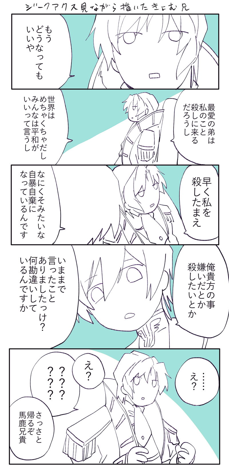 @maa☆quiet followDOODLEGQアベマで全話見ながら描いた虚無兄まんが(2枚目の絵の続き、3枚目は出てきたなんらかのボツ絵)、しゃり○さん確かに大いなる愛を感じた…虚無の理解者は虚無…なるほどすぎる…虚無への解像度が上がった気がする…しゃり○さんもしゃ○さんも幸せになってほしい…シュナ兄の見えている世界もあんなに灰色だったらやばい ##ギアス腐 show all(+2 images) Tap to full screen (size:1956x4027).Repost is prohibited @maaDOODLE通話会で公式アンソロの話題になってピンナップの兄上 @maaDOODLE通話会のお誘いいただいて偽サ〇リオコラボ(+虚無虚無プリンネタ)兄の虚無についてどう感じているかも伺って私もその考え方もある~😇みたいな色々な考え伺うの大事すぎる…楽しかったです!26日公募でお話会開催するみたいです☺️兄上本人が自身の虚無についてよく分かっていなそうなのに我々に分かるわけがないとおっしゃっていて…なるほど… @maaDOODLEうっ…大統領兄かっこよ… @maaDOODLEUFOのテレビ番組見てリヴァルくんUFO好きそう…🛸兄上、大国の宰相なら国家機密知ってそう…🫢ってなって描いたお泊まり会(オチなし)うぇぶぼわー幸せそうなシュナルル私も好きですうう☺️(握手)ちいかわ笑ってもらえてよかったです😂わあ…って泣いてるくまになっちゃった @maaDOODLE幸せそうな絵を描くのが1番楽しい兄上がル君が生きてると分かった時に微笑んだシーンがめちゃめちゃ…好き…うぇぶぼ、さっと一言残してくださったり気軽に使ってもらえて嬉しいです☺️ @maaDOODLEむずかしい・・兄の虚無とはこうだ、とはぜんぜん思えていなくて…虚無むずかし…こうなのかな…って描きながら探ってる…むずかし… recommended works 七月夏生DOODLE2017年 ハロウィン 司くんとレオくん crystal_earthDOODLE10分ドロー練習用お題:真宵ちゃん&ハミちゃん(逆転裁判) 後藤DONE逆転裁判 綾里真宵ちゃん マヨイちゃん好きだ……… 後藤DOODLEはみちゃん 逆裁2すきですちょっと成長したはみちゃんもすきです hachi88maDOODLE器用で面倒見のいいユガミン(想像) 橙医(tayutoh)PASTトレスイエマジェピピック 橙医(tayutoh)MAIKING描きたいキャラだけ描いたらカオス かほる(輝海)DONE龍一と真宵が好きなかほるさんには「宇宙の果てには何があるのでしょう」で始まり、「それだけで充分」で終わる物語を書いて欲しいです。できれば6ツイート(840字)以内でお願いします。https://shindanmaker.com/8016646終了後、恋人設定。真宵ちゃんの思考回路は想像するのも難しいね(*´ω`*)法廷に向けて、今日からしばらく書き溜めてみる(*´艸`*) 2 _ITO__CHI_DONE朱桜くんお誕生日に向けて、勝手にカウントダウンしていました☺(一部途中で止まった漫画も入ってますwその日漫画書き上げるほどの時間がなかったので…そのままずるずるとイラストに切り替わってます)朱桜司くん、お誕生日おめでとうございます。大好きです。 29
