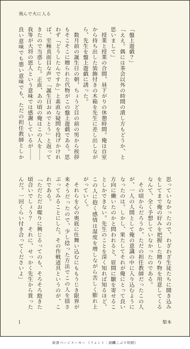 梨本🍐☆quiet followDONETitle:飛んで火に入る本編時空、支援C→Bの移行期間想定です。盤上遊戯で遊ぶ二人。抱える感情に名前を付けて決めつけてしまうシルのお話。【注意点】・盤上遊戯のルールやら何やらを捏造しています。 show all(+6 images) Tap to full screen (size:618x1132).Repost is prohibited Let's send reactions! freqpopularsnackothersPayment processing Replies from the creator Follow creator you care about!☆quiet follow 梨本🍐DONETitle:袖を引く※現パロ※大学講師の先生宅に度々入り浸っているシルの話です。いつものやつ。甘いけど甘くない誕生日の夜の話。【注意点】・現パロ→カタカナ語が登場します。 4 梨本🍐DONETitle:荒療治※現パロ※ナチュラルに同棲をしているし隣で寝てるレトシル。知らないはずなのに何故か知っているような先生が夢に出てくるシルの話です。【注意点】・現パロ→カタカナ語が登場します。 5 梨本🍐DONETitle:故意犯※現パロ※1ページレトシル。 梨本🍐DONETitle:十数年後の約束※現パロ※半同棲時空。大学で講師を勤めている先生と、大学生のシル。シルが事ある毎に先生の家に泊まり込んでいるような関係性です。付き合ってるんだか付き合ってないんだか。【注意点】・現パロ→カタカナ語が登場します。・星の知識は聞き齧った程度です。(フィクションとして読んでいただけた方が良いかと思われます) 6 梨本🍐DONETitle:飛んで火に入る本編時空、支援C→Bの移行期間想定です。盤上遊戯で遊ぶ二人。抱える感情に名前を付けて決めつけてしまうシルのお話。【注意点】・盤上遊戯のルールやら何やらを捏造しています。 7 梨本🍐DONETitle:雰囲気※現パロ※レトシル短文。現パロだし付き合ってるし何ならナチュラルに同棲もしてる二人です。【注意点】・現パロ→カタカナ語が普通に登場します。 3 recommended works __k_tkDONE丹穹webオンリー2回目開催おめでとうございます。今更ながらハロウィンネタで短い漫画を描きました。楽しんでいただければ幸いです。 7 ざだるおんDONEノイ響えっち🔞🔞🔞過激で激しいのを求めるノイ響だよー!未成年は読まないでね 3062 なち🎲DOODLE今日描いた因さん※若干の祝福シナリオバレ有❕増える可能性 6 dahachiii_DOODLEsếch iofamnDONEイベントありがとうございました❗️ 9 piyoman_pandaDONEアイビスのアニメ背景(学校の階段)、(学校(図書室:夕暮れ)で嵯峨律🐈⬛🌸律っちゃんにくっつき魔な嵯峨先輩。 2 おかゆDONEお渡ししたカードにパスワード記載してます。 3048 gray_31toDOODLEハレス兄さん SYTHEDOODLECurious under there.