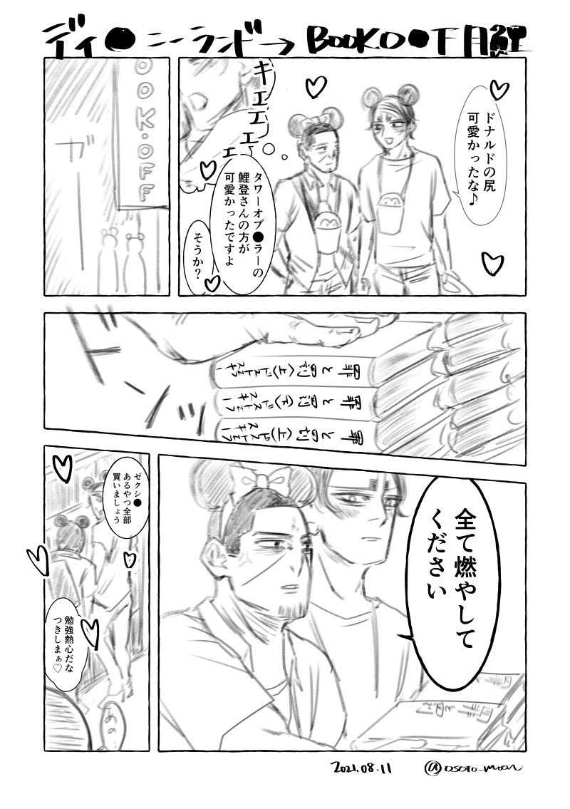 ムルカさん(@quarantagats)との戯れで描いたディ●ニー▶︎BOO●OFF月鯉。鯉登さんに出会うまで罪…を暗唱できるほど読み込んでた月島、本ごとに違うルールで線引きしてある。広義の「必要ない」漫画…。