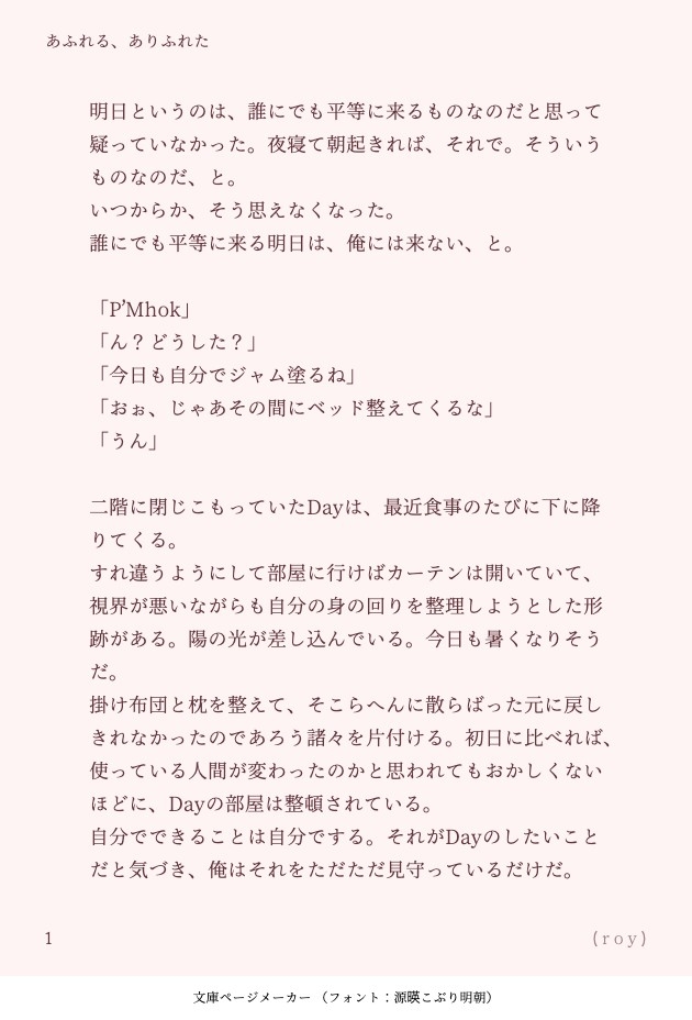 _roy_JS_☆quiet followDONEMhokDay『あふれる、ありふれた』MhokはいつからDayに触れたいと思うようになったんだろうなぁ💭 #MhokDay show all(+6 images) Tap to full screen (size:630x928).Repost is prohibited Let's send reactions! freqpopularsnackothersPayment processing Replies from the creator Follow creator you care about!☆quiet follow _roy_JS_DONEもくでぷんたれ夏休み🥘④「主導権はMhok」-マロより🙏🏻MhokDay『あなたにはかなわない』実は③と④はリンクしています🙆🏼もしお時間あれば両方とも読んでみていただけると嬉しいです☺️こういう日常があったらいいなぁ、と思いながら書きました✍️ 7 _roy_JS_DONEもくでぷんたれ夏休み☀️③「実は主導権を握っているのはDay」- マロより🙏🏻MhokDay『きみにはかなわない』マロでリクエストをいただいたものでした☺️普段お互いに「かなわないなぁ」と思っている部分がこんなんだったらいいなぁ…ということを考えながら書きました🙆🏼楽しんでいただけたら嬉しいです♡ 6 _roy_JS_DONEもくでぷんたれ夏休み🌻②「泣いているくせに力が強いPuen」- りべまるさんPuenTalay『37.1℃をちょうだい』りべまるさんから頂いた「泣いているくせに力が強いPuen」でした☺️ぷんたれ欲をば〜ん!と放出できたおはなしでした😌(ほんと、何故かわたしの書くぷんたれいつも長い…ですね…) 12 _roy_JS_DONEもくでぷんたれ夏休み🌊なつやすみ企画のおはなしは番号順にアップロードします🙆🏼①彩り - Haru2さんMhokDay『花色に還る』とてもすてきなリクエストでした☺️お互いがお互いの「彩」なもくで、いいですよねえ〜◎(ちょっとした仕掛けがあります😌楽しんでいただけたら嬉しいです💭) 8 _roy_JS_DONEMhokDay『bring me dawn』『gaze into you』のつづきです。ep.6のMhokはこんなことを考えていたのかな?という気持ちで書きました😌マラソン大会までもう少し…!(笑)Dayちゃんサイドのも書きたくなっちゃうんだよなぁ〜〜〜 10 _roy_JS_DONEMhokDay『gaze into you』ep.5〜のDayに寄り添い続けるMhokが好きで、ずっと書きたいと思っていました〜。長くなりそうだったので、ひとまずここで😂いろいろ自覚して変わっていくMhokを書くのが楽しい。自分なりの本編中のセリフの解釈だったり、「このときこんなこと考えてたのかな」とかを考えるのが好きなので、書いていてとても楽しい〜!マラソン大会まで書くぞ〜〜 6 related works _roy_JS_DONEMhokDay『awake from bitter dream』見えないDayにとって、Mhokの声はみちしるべみたいなものだったのかもとか考えてしまう。Porjaiちゃんにもしっかり愛されてるDayが書けたのは収穫💪🏻 5 _roy_JS_DONEMhokDay『雨、3月某日』初めて書いたもくで✍🏻 7 _roy_JS_DONEMhokDay『14:52』頭使わなくていい、ハッピーなもくでです🥰🥰「やきもちをやくMhok」という、天才的なお題をマロでいただいたものでした。感想でもリクエストでも、いただけるの本当に嬉しいです。 8 _roy_JS_DONEMhokDay『きょうは、なんの日』実はこれ、以前書いた千星創作の踏襲です。こういう書き方が昔から好きで、しょっちゅう書いては消しています。「さすがに飽きるって…」って言いながら😂色が飴ちゃんみたいで可愛いよなぁ〜と他人事のように思っています🍬 4 _roy_JS_DONEMhokDay『16:21』マロでリクエストいただきました、「『14:52』のつづき」のおはなしです🥰🥰こう、なんというか…もくでってお互いのこと本当に大事に思っているんだよなぁって考えながら書いた気がします。 8 _roy_JS_DONEMhokDay『きみの、ぜんぶ』ぴもを甘やかすことを覚えたでーはつよい()ぴもの独占欲、でーの包容力どちらもおいしい 10 _roy_JS_DONEMhokDay『あふれる、ありふれた』MhokはいつからDayに触れたいと思うようになったんだろうなぁ💭 7 _roy_JS_DONEMhokDay『gaze into you』ep.5〜のDayに寄り添い続けるMhokが好きで、ずっと書きたいと思っていました〜。長くなりそうだったので、ひとまずここで😂いろいろ自覚して変わっていくMhokを書くのが楽しい。自分なりの本編中のセリフの解釈だったり、「このときこんなこと考えてたのかな」とかを考えるのが好きなので、書いていてとても楽しい〜!マラソン大会まで書くぞ〜〜 6 _roy_JS_DONEMhokDay『bring me dawn』『gaze into you』のつづきです。ep.6のMhokはこんなことを考えていたのかな?という気持ちで書きました😌マラソン大会までもう少し…!(笑)Dayちゃんサイドのも書きたくなっちゃうんだよなぁ〜〜〜 10 recommended works potgaiiDOODLE安赞 多喝牛奶身体棒 _roy_JS_DONEMhokDay『雨、3月某日』初めて書いたもくで✍🏻 7 _roy_JS_DONEMhokDay『あふれる、ありふれた』MhokはいつからDayに触れたいと思うようになったんだろうなぁ💭 7 _roy_JS_DONEMhokDay『awake from bitter dream』見えないDayにとって、Mhokの声はみちしるべみたいなものだったのかもとか考えてしまう。Porjaiちゃんにもしっかり愛されてるDayが書けたのは収穫💪🏻 5 _roy_JS_DONEPuenTalay『しあわせの正体』孤独なPuenは、さみしがり屋のTalayに癒されていたんだろうな、なんて思ったりする🫠 10 _roy_JS_DONEMhokDay『溶けて、満ちて』Day
