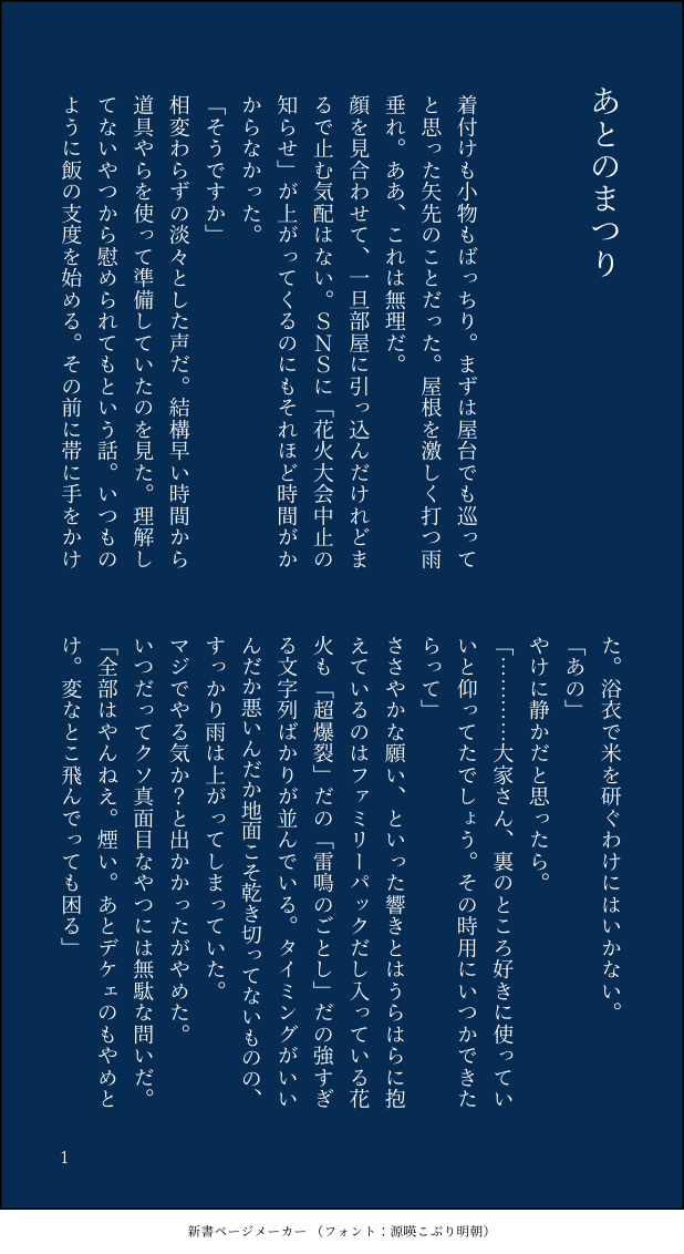 tokoko_kabe☆quiet followDONE花火してる地槍。※現パロ同棲時空&短いです #地槍 #SS show all(+1 images) Tap to full screen (size:618x1132).Repost is prohibited Let's send reactions! freqpopularsnackothersPayment processing Replies from the creator Follow creator you care about!☆quiet follow tokoko_kabeDONE花火してる地槍。※現パロ同棲時空&短いです 2 tokoko_kabeDONE大遅刻ですがキスの日にかこつけた地槍です。気持ちかなり糖度高い(当社比)カルデア召喚時空。 3 tokoko_kabeSPOILER奏章4某所についてのSS(天草くんと怠惰ちゃんが話してるだけ)※ネタバレ有&妄想と捏造しかない 2 tokoko_kabeSPOILER天草くんと怠惰ちゃんが話してるだけのSS※奏章4ネタバレ有&妄想と捏造しかない 5 tokoko_kabeDONE地槍同棲時空の現パロ。手巻き寿司を食べる話。ペーパーに間に合わなかったのでこっちにのっけました。よかったら。 7 tokoko_kabeDONE地槍の大遅刻ホワイトデー小噺。現パロ。 3 related works tokoko_kabeDONEランサーちゃんとオルタちゃんがショッピングに行く話。地右衛門くんは登場しませんが地槍です。※ジャンヌ族姉妹設定・現パロ有 5 tokoko_kabeDONE地槍同棲時空の現パロ。手巻き寿司を食べる話。ペーパーに間に合わなかったのでこっちにのっけました。よかったら。 7 tokoko_kabeDONE大遅刻ハロウィン地槍SS。短い。 3 tokoko_kabeDONE大遅刻ですがキスの日にかこつけた地槍です。気持ちかなり糖度高い(当社比)カルデア召喚時空。 3 Ashunaro50DOODLE地槍ちゃん tokoko_kabeDONEカルデア召喚時空のバレンタイン地槍SSです。 4 tokoko_kabeDONE地槍の大遅刻ホワイトデー小噺。現パロ。 3 tokoko_kabeDONE花火してる地槍。※現パロ同棲時空&短いです 2 recommended works 高間晴DONEチョロおそSS名刺5枚。http://neko2.net/yubi5/「ふれあうひとに6」をお借りしました。 5 y_satoriMOURNING※SS名刺メーカー使用の短文ですなんか昔作ったのを発掘したので。だいたいファンタジー 4 knipe_DOODLE同棲している主明思ったより夜が肌寒い日に上着忘れた明智くん 2 nekonokanndumeDONE昨日柚から明さんのお誕生日SS貰ったので!明さんと芽さんのお話です 5 りんぶるDONEミトスが深夜の森でティトレイを見つける話。4部イメージ 18 ma5taro_3DONE【tkri🌟🎈】付き合いたての🌟🎈がバイト帰りに🍜を食べる話。 5240 shiomiduPROGRESSジククリ本表紙こんな感じで。センスなど知らん。 tomobita_divDOODLE銃兎の体に噛みつきたくなった理鶯の話。おもいっきりスケベなので注意。むしゃくしゃ落書き 2337 moldale912TRAININGENNゆるワンドロ企画さまによる第4回お題【あ、その表情好きだな】。どんどん短くなってきました。 1964