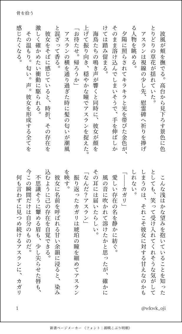 wkwk_oji☆こそフォロ過去のを晒す慰霊碑参拝後に最期について話すアスカガ すべて表示(+5枚) タップで全画面(原寸:618x1132)無断転載禁止 リアクションをたくさん送って応援しよう! よく使う人気おやつその他支払処理中 作者からのリプライ 気になる人をどんどんフォローしよう!☆こそフォロ wkwk_ojiできたエメナイ16開催おめでとうございます!(新作)💋話予定していた新作じゃないのですが、お祭りの賑やかしになれば! 4 wkwk_oji過去のを晒す2026年あけましておめでとうございます🌅姫はじめ感の薄い姫はじめ話(⚠︎結婚後)🔞アスカガ 10 wkwk_oji過去のを晒すショック療法清算するアスカガの話途中だったのを書ききりました🐢※ユウナのことを未だに許してない人間が書いている 33 wkwk_oji過去のを晒す🔞🪒アスカガ先に謝っておきます。ごめんなさい。 8 wkwk_oji過去のを晒す🍒食べてふわっとした話をするアスカガの話人生、漠然とした不安を感じるときある 6 wkwk_oji過去のを晒す🔞フロントホックとあれやそれアスカガ(⚠︎カガリが頑張ってるところあり)ナチュラルに結婚しているふたり 16