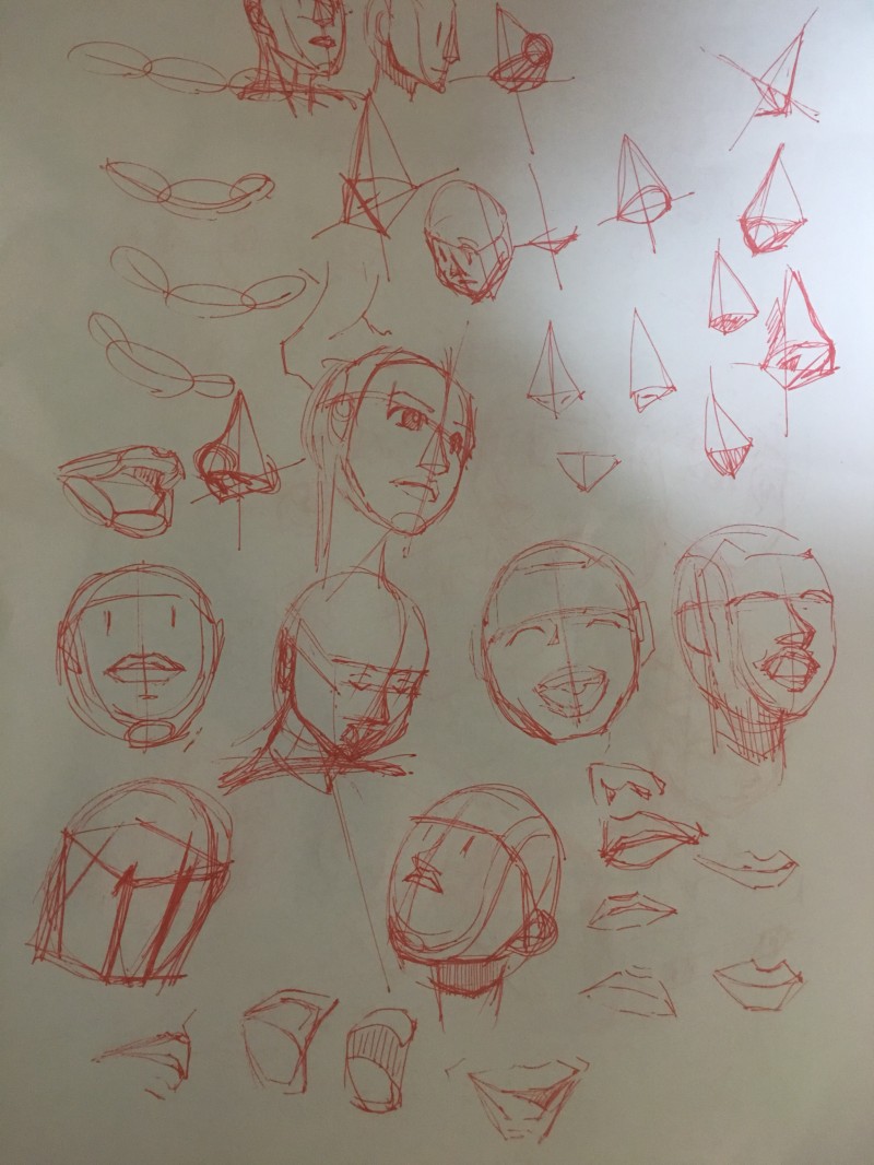 やはり顔(のっぺら)を自由な角度で描くのができない。多少は立体的に書けるようになったような、模写しているからかけている感じはつよい。特にアオリ俯瞰になった時のパーツの比率(鼻のおおきさ、口がどれくらい見えるか)バランスをどう取るのかがわからない。本のどっかに書いてあるのかも。探します。