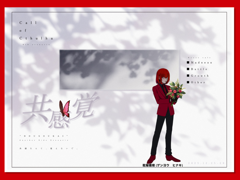 SKYBLUE_p16☆quiet followINFO2025/12/25 - 2025/12/27クトゥルフ神話TRPG『共感覚』作者:櫻庭𝐊𝐏:Noえl。𝐏𝐂 / 𝐏𝐋眩耀雛菊 / 天然記念物END-4▸ 生還にてシナリオ終了 Tap to full screen (size:2732x2048).Repost is prohibited Let's send reactions! freqpopularsnackothersPayment processing Replies from the creator Follow creator you care about!☆quiet follow SKYBLUE_p16INFO2025/12/25 - 2025/12/27クトゥルフ神話TRPG『共感覚』作者:櫻庭𝐊𝐏:Noえl。𝐏𝐂 / 𝐏𝐋眩耀雛菊 / 天然記念物END-4▸ 生還にてシナリオ終了 SKYBLUE_p16INFO2025/12/06 クトゥルフ神話TRPG『エレベーターの恐怖』作者:ニム𝕂ℙ:Noえl。ℙℂ𝟙 渡会 流 / 凹みℙℂ𝟚 神鳴月紫音 / 天然記念物ℙℂ𝟯 花園鈴蘭 / 望月蓮ℙℂ𝟜 紡木 絢芽 / 筑波カナデEND A▸ 全生還にてシナリオ終了 SKYBLUE_p16INFOセッションネタバレありpass:ok? 3 SKYBLUE_p16INFO2025/11/01 クトゥルフ神話TRPG「Aspferoce」KP:Noえl。HO1:HO1 芴条 奏善 / 満月蓮HO2:HO2 泡影 縁 / 凹みEND A▸ 両生還にてシナリオ終了 SKYBLUE_p16INFO2025/10/25クトゥルフ神話TRPG「バレンタイン♡新大久保捜査線」KP:Noえl。HO紅色 愛染 海琴 / 筑波カナデHO守銭奴 鹿目 兎一 / 天然記念物HO無能 無能 栄作 / 満月蓮HO重犯罪 眼田 梵 / 凹みHO妄執 一本木 恋々 / サイケデリック生坊主END A全生還にて生還 SKYBLUE_p16INFO-Call of Cthulhu-『モニタリング・モニター』| PC/PL(敬称略)◾︎ 鹿目 ツクヨミ/天然記念物◾︎ 波田 蒼/NoえlEND-D(生還) recommended works 博物少女志DOODLE 2 Turtle_GHDOODLE貊泽长批 2 komekoexDOODLE秋のえろ祭りフォロワリク触手姦のえっちなサンポ18↑?y/n 2 kamoyuzu_1945MEMOCoC6版「厄介者とは最後まで」作者:ぽるんが様KP:鴨柚HO1:律輝さん(滝谷寧音)HO2:ユアナースさん(大石京介)両生還にてセッション終了お疲れ様でした!この2人ほんとヒヤヒヤさせるわァ…ダイスの女神は狂ってやがるぜwww帰って来れて良かったね(*^^*) yukiusako06SPOILERカーテンコールに祝福の歯車を Hehe11115DOODLEhi yamada_achikoINFOクトゥルフ神話TRPG「かいぶつたちとマホラカルト」全生還KP:流々さんHO1:狼/あちこHO2:魔女/ちりあくたHO3:鬼/なんしぃHO4:天使/ななつ げぼくDOODLER-18↑? yes/no 3 雪風(ゆきかぜ)。DONE3月3日はヒナギク祭り🌼🌼