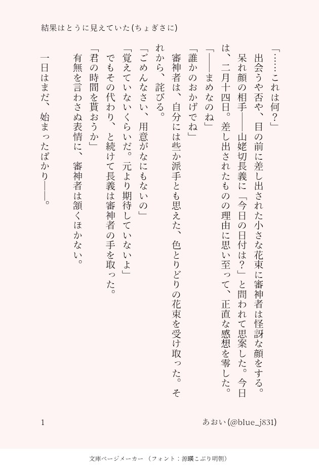 blue_j831☆quiet followDONE銀瑠璃の夢開催おめでとうございます!過去作SSSバレンタインデー&ホワイトデー。続きもの。※創作審神者になります。政府の職員を兼業している、という設定がうっすら出てきます。パスワードは「カップリング名(ひらがな)+2日目の日付4桁」です。 #ちょぎさに inTheMannerOf... #ちょぎさに_銀瑠璃の夢 show hide show all(+3 images) Tap to full screen (size:630x928).Repost is prohibited Let's send reactions! freqpopularsnackothersPayment processing Replies from the creator Follow creator you care about!☆quiet follow blue_j831DONE銀瑠璃の夢開催おめでとうございます!過去作SSSバレンタインデー&ホワイトデー。続きもの。※創作審神者になります。政府の職員を兼業している、という設定がうっすら出てきます。パスワードは「カップリング名(ひらがな)+2日目の日付4桁」です。 4 blue_j831DONE銀瑠璃の夢開催おめでとうございます!過去作です。極修行お見送りによせて書いたもの。※創作審神者になります。政府の職員を兼業している、という設定が出てきます。パスワードは「カップリング名(ひらがな)+2日目の日付4桁」です。 4 blue_j831DONE銀瑠璃の夢記念に公開。日々の仕事で疲れた審神者とそれを知っている長義の話。※創作審神者に、政府の職員を兼業している、という設定があります。パスワードは「カップリング名(ひらがな)+2日目の日付4桁」です。 4 blue_j831DONE銀瑠璃の夢開催おめでとうございます!過去作SSSです。意味深な感じで終わりますが続きません。※創作審神者になります。政府の職員を兼業している、という設定が(うっすら)出てきます。パスワードは「カップリング名(ひらがな)+2日目の日付4桁」です。 blue_j831DONEみかみつ7開催おめでとうございます!新作そのに!パスワードは「カップリング名+イベント2日目の日付4桁」になります。バレンタインネタ。数年寝かせていたんですけど、期せずしてホットになってしまった感がある(原作展開的に)短くまとめあげてしまったので、加筆できたらいいなと思います。 3 blue_j831DONEみかみつ7開催おめでとうございます!新作です!パスワードは「カップリング名+2日目の日付4桁」です。2024年三日月宗近展示によせて。刀剣男士ではない、でも既に刀剣の付喪神として現れているふたりとして読めるように書いたつもりです(どうかな……?)(趣旨とはちょっと外れてしまうかもしれませんが……)その未来は、みかみつとか、刀剣男士とか、いろいろな機会で。出逢えてありがとう。 2 related works 南野ろんPAST てばきちDOODLEpixivのキス22箇所のテンプレをお借りしていますキスしてます※※※刀×主♂です※※※ かおるこDOODLEデッサン練習がてらせっかくなので(?)ラキスケちょぎさに(一応肌色注意) 4 katana_saniwa_PASTちょぎさに/采配審神者♀います。甘くもシリアスでもない。流血、怪我表現あり。過去にXにあげていたものの再掲です。 2 日比谷オレンジPAST過去に出した長義さに本表紙絵 むげもちMEMO一枚目:楽しい(?)謎ちょぎにゃんずお二枚目:男さにわ本丸で女さにわに夢見るちょ(シマムラパーカー買った記念)三枚目:さにわに恋する不器用ちょ二番煎じ(毎度薄雑で見えない自分用🙇) 3 日比谷オレンジPAST性癖だけをつめた長義さに♀のエロ落書きです 2 あず吉PASTちょぎさにの絵1枚目はtwstの監督生ちゃんもいるけど許して 5 a_y_u_meDONE recommended works siroko005PASTみ・か・つ・る!! ① 3 siroko005PASTみ・か・つ・る!! ② 2 superaerial701DOODLE疲れた時には鶴吸いに限るなぁ(描いている最中は『後頭部』という身も蓋もないタイトルでした 笑) u_i_p_DOODLE両片思いのちょぎさにが想いを伝えられないまま別れの時が来てしまう話。独自設定強めです。 1967 superaerial701DONEみかつるワンドロワンライさんのお題で「街歩き」人知れず夕暮れ時の街歩き。背景素材お借りしました。🐥「三日月~二段飛ばしだぜ!小さい頃を思い出すなぁ」🌙「ふふ、転ぶなよ」 ユミヲDONEいちさにとちょぎさにです。元々はバレンタインデー用の絵でしたが、全然間に合いませんでしたww tsuzuri0505DONEDay21_Cookingささろ #30DaysCPChallenge 3 chocohamadakaDOODLEちょぎさに(顔なしサニワ有) 6 莉子/りしDOODLE多分着替えなさそうだけど、二次創作だからいいじゃない‼️やたら着なれてる感あって105ちゃんドキドキすればいいと思う(無自覚)23/07/28
