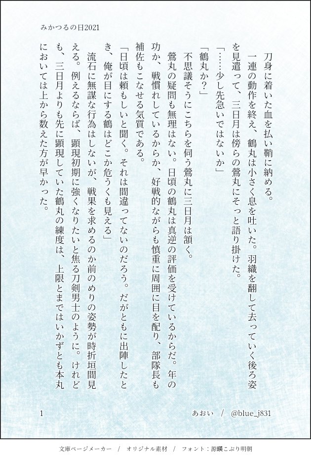 blue_j831☆quiet followDONEちょっと長めのお話です。ゆくゆくは本にしたい……とか思ってたり。私の書くふたりにしては少し初々しいふたりです。パスワードは『カップリング名+イベント2日目の日付を4桁』です。 show hide show all(+5 images) Tap to full screen (size:630x928).Repost is prohibited Let's send reactions! freqpopularsnackothersPayment processing Replies from the creator Follow creator you care about!☆quiet follow blue_j831DONE銀瑠璃の夢開催おめでとうございます!過去作SSSバレンタインデー&ホワイトデー。続きもの。※創作審神者になります。政府の職員を兼業している、という設定がうっすら出てきます。パスワードは「カップリング名(ひらがな)+2日目の日付4桁」です。 4 blue_j831DONE銀瑠璃の夢開催おめでとうございます!過去作です。極修行お見送りによせて書いたもの。※創作審神者になります。政府の職員を兼業している、という設定が出てきます。パスワードは「カップリング名(ひらがな)+2日目の日付4桁」です。 4 blue_j831DONE銀瑠璃の夢記念に公開。日々の仕事で疲れた審神者とそれを知っている長義の話。※創作審神者に、政府の職員を兼業している、という設定があります。パスワードは「カップリング名(ひらがな)+2日目の日付4桁」です。 4 blue_j831DONE銀瑠璃の夢開催おめでとうございます!過去作SSSです。意味深な感じで終わりますが続きません。※創作審神者になります。政府の職員を兼業している、という設定が(うっすら)出てきます。パスワードは「カップリング名(ひらがな)+2日目の日付4桁」です。 blue_j831DONEみかみつ7開催おめでとうございます!新作そのに!パスワードは「カップリング名+イベント2日目の日付4桁」になります。バレンタインネタ。数年寝かせていたんですけど、期せずしてホットになってしまった感がある(原作展開的に)短くまとめあげてしまったので、加筆できたらいいなと思います。 3 blue_j831DONEみかみつ7開催おめでとうございます!新作です!パスワードは「カップリング名+2日目の日付4桁」です。2024年三日月宗近展示によせて。刀剣男士ではない、でも既に刀剣の付喪神として現れているふたりとして読めるように書いたつもりです(どうかな……?)(趣旨とはちょっと外れてしまうかもしれませんが……)その未来は、みかみつとか、刀剣男士とか、いろいろな機会で。出逢えてありがとう。 2 recommended works よかDOODLEミニみかつる smyd_0127CAN’T MAKE長義と代行人の馴れ初め的な… superaerial701DOODLEお祭り衣装良いですねぇ良いですねぇ。お忍び🌙さんもこれにはニッコリ。諸事情で現地参戦できないので間違っているところ多々あると思いますがご容赦を。 おりさんDONEみかみつ7開催ありがとうございます!!!そしておめでとうございます🎉🎉🎉新要素の『宝物』をネタに少しだけ物語を組みました。楽しんで頂けたら幸いです🥹🙏良ければメッセージ頂けるととても励みになります😭🙏事前に応援メッセ下さった方々もありがとうございました😭感謝…寝ます( ˘ω˘ ) 12 blue_j831DONEみかみつ7用に公開。過去のみかつるの日のSSでした。大好きです、花言葉。パスワードは「カップリング名+イベント2日目の日付4桁」になります。 4 blue_j831DONEみかみつ7開催おめでとうございます!新作です!パスワードは「カップリング名+2日目の日付4桁」です。2024年三日月宗近展示によせて。刀剣男士ではない、でも既に刀剣の付喪神として現れているふたりとして読めるように書いたつもりです(どうかな……?)(趣旨とはちょっと外れてしまうかもしれませんが……)その未来は、みかみつとか、刀剣男士とか、いろいろな機会で。出逢えてありがとう。 2 superaerial701MOURNING内番がんばっているのでアイスどうぞ、なみかつる。ひらいてタグに参加しようとして全く間に合わなかったやつです。下書き5段階あるうちの2ぐらいの状態。いろいろ歪んでますなぁ。気力があれば仕上げたいです。 ミッツビーDOODLE宇妓自信のないお兄ちゃん。フェ◯してます。 3 小雀蒼生PROGRESS今年の描き納めは漫画にすることにした