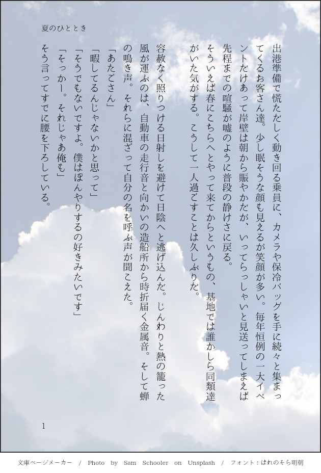 新米の冒険 駅から続く電車通りから外れて海沿いの遊歩道を軽く駆け抜け、公園の端まで来るとそこから人々が憩う様子をふわふわと潮風を浴びながら眺める。この景色は元々は海から見る予定であったけれども、あいにく天候の折り合いが悪くて叶わなかった。それ自体はいまも残念に思っているものの、こうして別の機会にでも自ら赴けるあたり、人の身に意識を宿したことのありがたさを感じる。まだ慣れていないのもあってしばしばバランスを崩してしまうけれど。本体の性質のせいかこの身体でも走るのは好きだ。でもたまにはゆっくり歩くのも良いな、と遊ぶ幼い子供の笑い声や木々のざわめきを耳にしつつ元来た道を戻るべく振り返る。