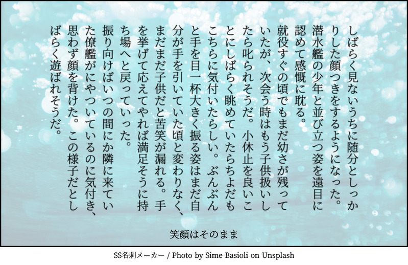 寝起きの少しぼんやりした頭で今日だなぁと思い出す。時刻と並んで表示されていた日付は八月二二日。かつて海へと滑り降りた日だ。当日朝は普段と違う様子に緊張していたのか、単に暑くて寝苦しかったか、もしくは夢見でも悪かったのか。起きてしばらくの間ぐずぐずと泣いて、立ち会いのしらゆきさんを困らせたような記憶が朧気に残っている。ただ、さすがのベテランと言うべきか、彼の気性ゆえか、あれこれと世話を焼かれている内にすっかり機嫌が治っていだから不思議なものだ。僕では同じように出来ないだろうと思う。艤装中に〝ふゆづき〟の舞鶴配備を知ってからは生まれ故郷とのことでしばらくご無沙汰だけど、と注を入れながらも馴染みの店をいくつか教えてくれたりもした。就役後に訪れると既に閉めているところも多くあったけれど、続いているところの中には自分も気に入って、通っているところもある。出港中ですぐには叶わないけれど帰ったら久しぶりに買いに行くのを楽しみにしていようと思う。
