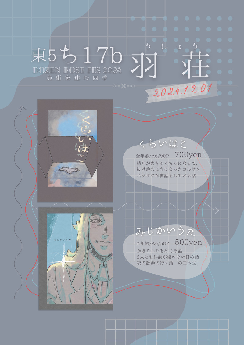 umj_wawawa☆quiet followMENU12/1 美術家達の四季 「東5ち17b 羽荘」お品書きです。(ウォーターマークを入れて後日Xや支部にも上げる予定です)【みじかいうた/A6/58P/500円】【くらいはこ/A6/90P/700円】※両方とも小説本になります。 Tap to full screen (size:1414x2000).Repost is prohibited Let's send reactions! freqpopularsnackothersPayment processing Replies from the creator Follow creator you care about!☆quiet follow umj_wawawaDOODLE12/1 美術家達の四季 無配のポストカードでした💫⭐️✨の部分は金色のマーカーで一枚ずつ描いていました。(ついったーに写真載せてます) umj_wawawaMENU12/1 美術家達の四季 「東5ち17b 羽荘」お品書きです。(ウォーターマークを入れて後日Xや支部にも上げる予定です)【みじかいうた/A6/58P/500円】【くらいはこ/A6/90P/700円】※両方とも小説本になります。 umj_wawawaINFO12/1 美術家達の四季で頒布予定の新刊表紙②【くらいはこ/A6/90P/700円】↓サンプル文リンクhttps://www.pixiv.net/novel/show.php?id=23409340 umj_wawawaINFO12/1 美術家達の四季で頒布予定の新刊表紙①【みじかいうた/A6/58P/500円】↓サンプル文リンクhttps://www.pixiv.net/novel/show.php?id=23404120 umj_wawawaDOODLE〈🔞⚠️〉🍊🌻甘々えっち 💛💛💛ってかんじ umj_wawawaDOODLE<🔞⚠️>🍊🌻 おくち 一生懸命なのかわい〜からなでなでされちゃう