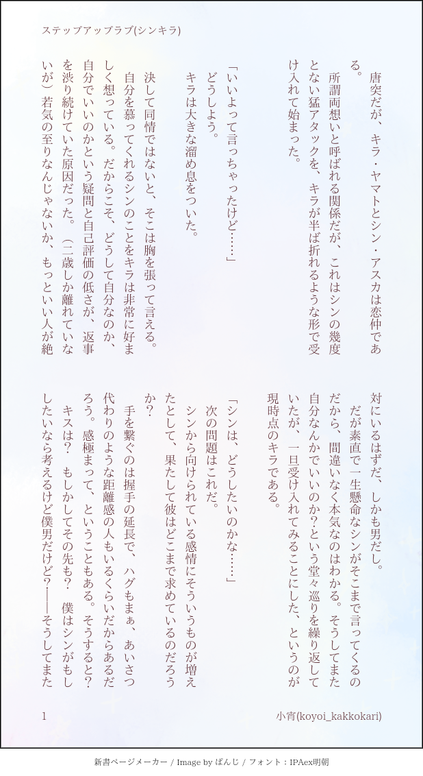 koyoi_kakkokari☆quiet followDONEステップアップラブ(シンキラ)お付き合いを始めたシンキラが(物理的に)歩み寄ろうとする話 #シンキラ cincilla show all(+5 images) Tap to full screen (size:618x1132).Repost is prohibited Let's send reactions! freqpopularsnackothersPayment processing Replies from the creator Follow creator you care about!☆quiet follow koyoi_kakkokariDONE以心伝心テレパシー?(シンキラ)キュピーンと手をさわさわする准将にムラムラするシンが書きたかった 4 koyoi_kakkokariDONE【アスキラ】Calendar girl2024ア誕! 企画にも参加させていただきました。キラさん不在だけど第三者視点とメイリンが好きなのでこうなりました。 4 koyoi_kakkokariDONE【アスキラ】ア誕ボツネタ供養。マジレスパンチ星人だよねっていう話。 koyoi_kakkokariDONE【シンキラ】なまはげポストカード引いて一瞬宇宙猫になったけど結局デートしてるじゃんと突然前向きになった時に書こうと思っていたやつをつい先日書きましたというもの 3 koyoi_kakkokariDONE【シンキラ】シン誕2024(のつもり)内容はお誕生日関係ないけどシン誕生日おめでとうのシンキラ MS乗ってない学生お隣さんパロの夏の暑い日の一幕的なやつ 8 koyoi_kakkokariDONE【R-18アスキラ】アフターモーニングアフター一応これ(https://poipiku.com/9854187/10258525.html)の続きというかおまけのつもりですがこれだけで読めます。映画後謎ハピエン時空でとてもとてもイチャイチャしているだけです。(二人ともプラントにもオーブにも自分用の部屋くらい借りてるだろうと勝手に思っています)PASS:18↑?(y/n 小文字で) 8 related works koyoi_kakkokariDONE味方と協力してクリアしよう!(シンキラ)私が某カー●ィが好きすぎるのでどうしても二人にSDXをやってほしいのでやってもらった謎時空です 3 結月(ゆづき)DONEワンドロの#キラ受け版深夜の真剣創作60分一本勝負に参加させて頂きました。絆創膏とあってこれが真っ先に浮かびました。 1159 yoriDOODLEシン挿れますよ?いいですよね?キラやだやだ、むりむりぃ(みちみちぐちぐち)やだっやんっゃぁっっしんっしんっっ構図が一緒なのは仕方ない画力の問題絡みむずいんだよ。。。 3 hanten102DOODLEガンダムSEEDDESTINY(シンキラ)化け物の産物*シンキラ未満かもしれません;;未来設定です。キラが化け物と蔑まれるシーンがあります。苦手な方はご注意下さい。 1241 koyoi_kakkokariDONEミイラ取りがミイラ(シンキラ)無重力とふよふよ浮いてる飲み物飲むやつに夢を見た結果 4 koyoi_kakkokariDONEステップアップラブ(シンキラ)お付き合いを始めたシンキラが(物理的に)歩み寄ろうとする話 6 koyoi_kakkokariDONE呉越同舟(アスキラ/シンキラ)タイトルは後から考えた幼なじみ/隊長の話してるときだけわかり手たちの夜をしてほしい 4 koyoi_kakkokariDONEおさわりOKとのことなので(シンキラ)映画中准将ずっと耳見えてるのかわいいなと思いましたの気持ちです koyoi_kakkokariDONE職場恋愛のすすめ(シンキラ)隊長って呼ぶのもキラさんって呼ぶのもいいよね……のお気持ち 4 recommended works hanten102DOODLE #キラ受け版深夜の真剣創作60分一本勝負ガンダムSEED(アスキラ)お題『お酒』*未来設定です。シン君が出てきますが傍観役です。アスキラどっちも酒弱いようで酒豪です。両片思い。ちょっと長くなったのでポイピクさんにお世話になってます。 1390 結月(ゆづき)DONE性癖パネル① 怪我(相手庇ってのもの)種時代の14×16シンキラ 2669 結月(ゆづき)DOODLE短編集②#CPにリプできたセリフ又はシチュもしくはアイテムで短編ssを書く頂いていた残りを書きましたー。いい所でぶった切った感が否めないけど、そこは妄想で補完をお願いいたしますm(_ _)m 5014 koyoi_kakkokariDONEおさわりOKとのことなので(シンキラ)映画中准将ずっと耳見えてるのかわいいなと思いましたの気持ちです koyoi_kakkokariDONE用法用量は正しく守りましょう(アスキラ)准将絶対魔剤飲みまくるタイプだと思うのでアスランに怒られてほしいの気持ちです 4 koyoi_kakkokariDONE呉越同舟(アスキラ/シンキラ)タイトルは後から考えた幼なじみ/隊長の話してるときだけわかり手たちの夜をしてほしい 4 koyoi_kakkokariDONEコピーアンドペースト(シンキラ)マイフリのガンプラたくさん並んでるのすごかったねという謎時空の短いシンキラです。 3 aoto0816MOURNING【オイルネタ】 1576 hanten102DONEガン種(アスキラ)赦されない罰で ※アスランに乱暴に抱かれたいと願うキラさんの話。ちょっと壊れてる話なのでこちらにポイしてます💦 1251