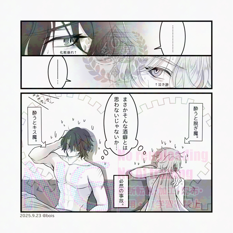 TLで酔うと脱ぎ魔な🦚をお見かけして、うちの🛀は元々酔うとキス間な設定だったので、その2人だと約束された未来…って感じになるな~と思って描いてみましたw
