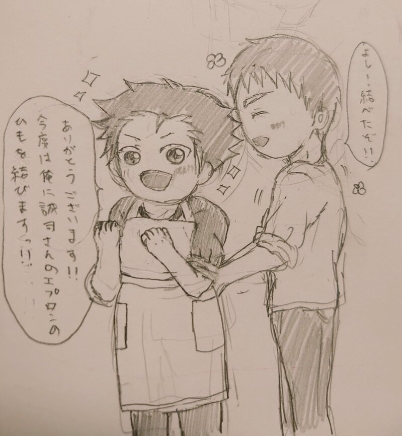 龍くんは結んで貰う時は、信玄さんにエプロンの紐を結んでもらうことや一緒にお料理することが嬉しくて終始キラキラしていたり、結んであげる時は誠司さんはやっぱりかっこいいなぁ!って思いが強くなってぎゅっと抱きついてみたりしていたら可愛いなと思いました(*^^*)