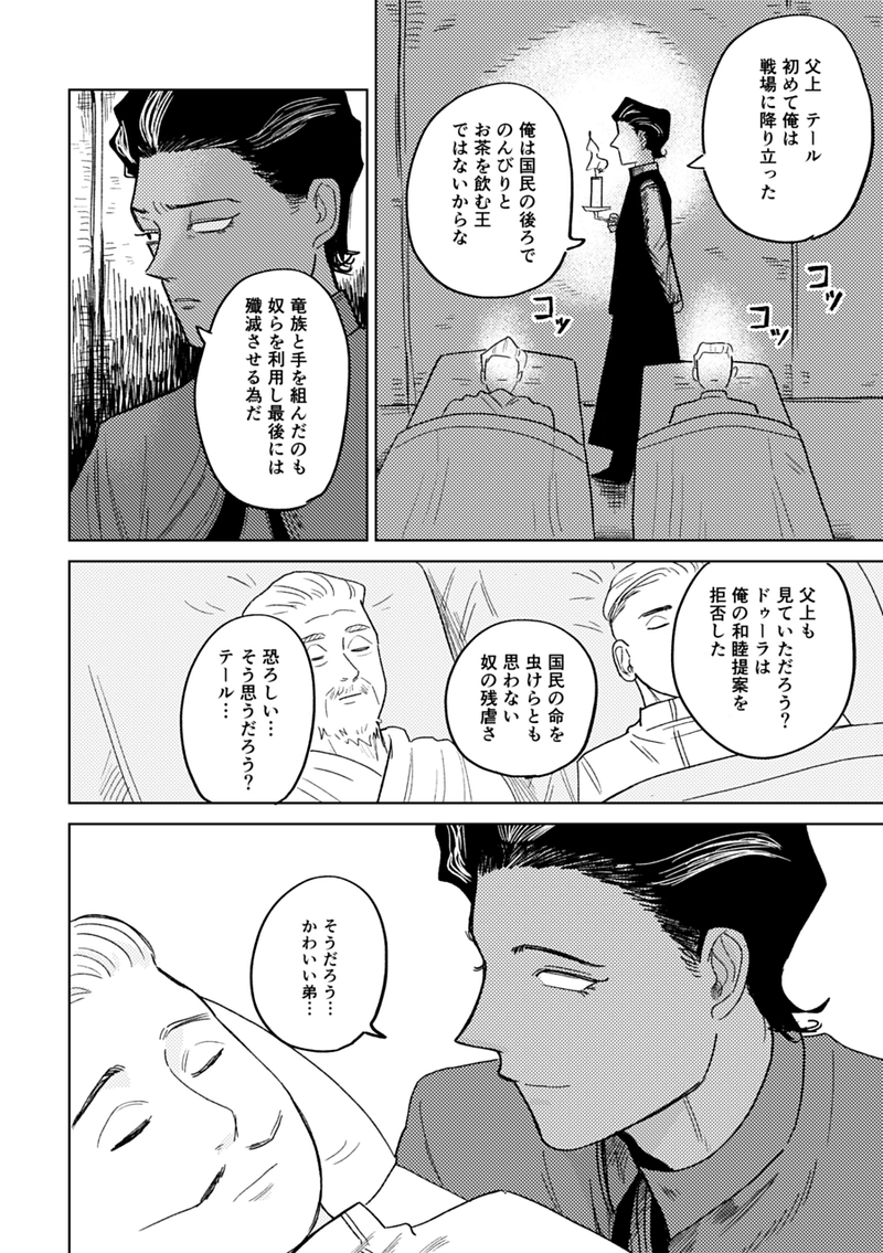 竜族と手を組むなんて倫理的にアカン事は第一王子も理解していてその狂気が自分の大事な者や物を壊される恐怖も理解してるからこそ最悪の選択ができる第一王子をかなり気にいるライエルさん見てぇなあまりにも残虐を隠しきれない第一王子を見て感心しながらも光竜王が守りたかった人間とはこんなもんだったぞと心の中で嘲笑いながらも心のどこかで堕ちてしまった光竜王を哀れに思うライエ