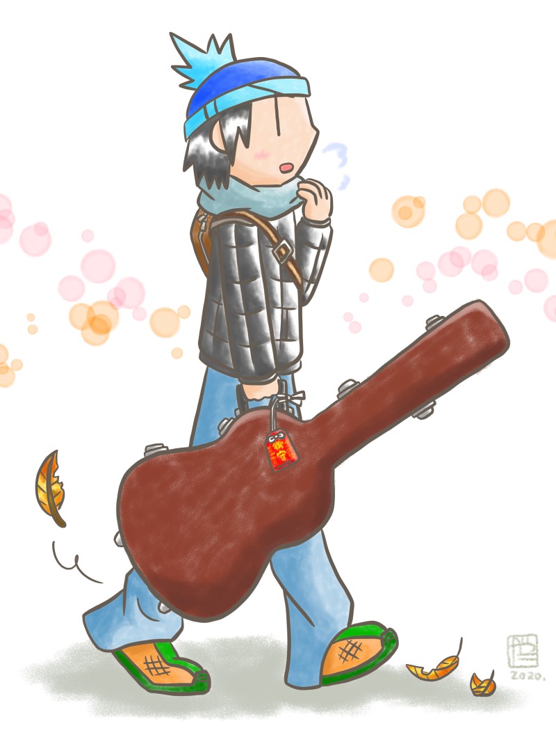 冬の装い健助氏です〜。季節っぽい絵を描きたかったのはあるけど、実はそれ以上にアコギのハードケースを描きたかった(超個人的萌え&燃え要素)ので…!!