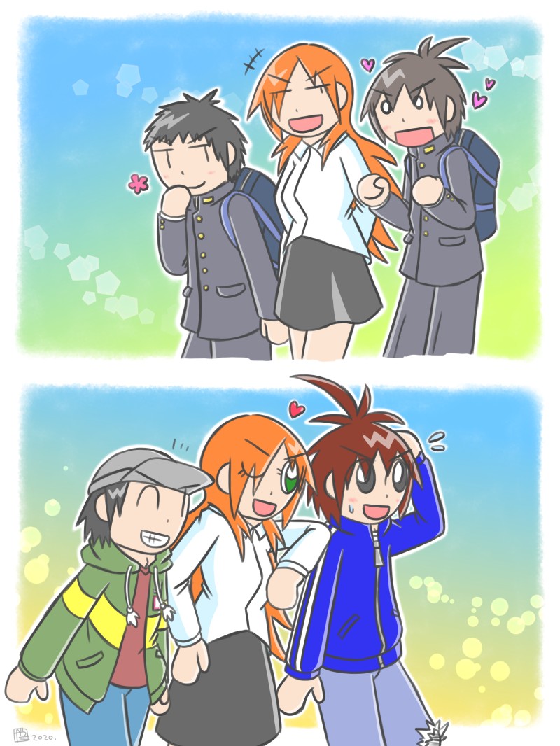 当方オリキャラ達の最初の3人、出会った頃と大人になった現在と…な感じです。大人になっても変わらず仲良しとか素晴らしく胸キュンだと自分は思っとります(強調)!!