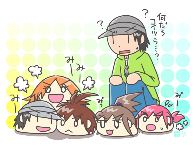 ちょっとゆっくり風デフォルメなど…ってなつもりで考え始めたのに、何故だか「自分らに似た謎のいきものと戯れる(?)健助氏」という画になってしまいました…でもこういうの描くの楽しいんだよなあw とりあえずこういういきものはみーみー鳴くというイメージもあったりw