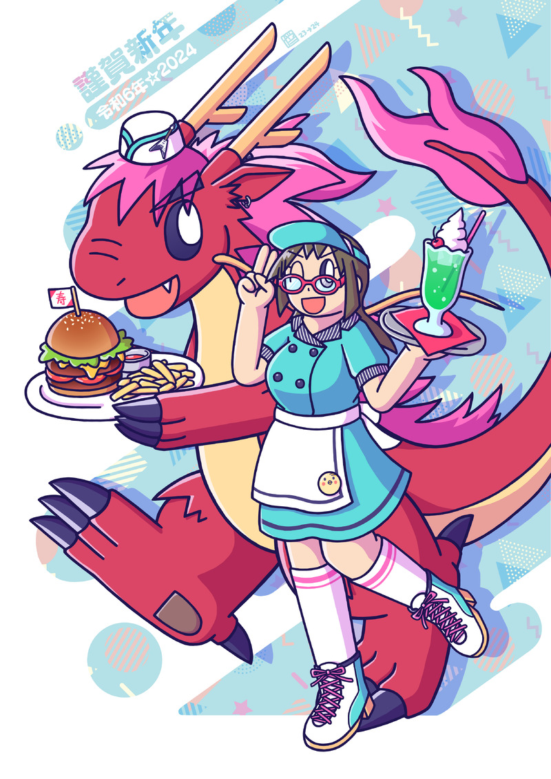 2024年版の年賀状を公開だ!今年は辰年ということで当方のドラゴン担当・駆くん(龍形態)とあおいさんの幼馴染アベックにご登場いただきました!で、自分がただ描きたかった…という理由でアメリカンダイナー風コスになっておりますw